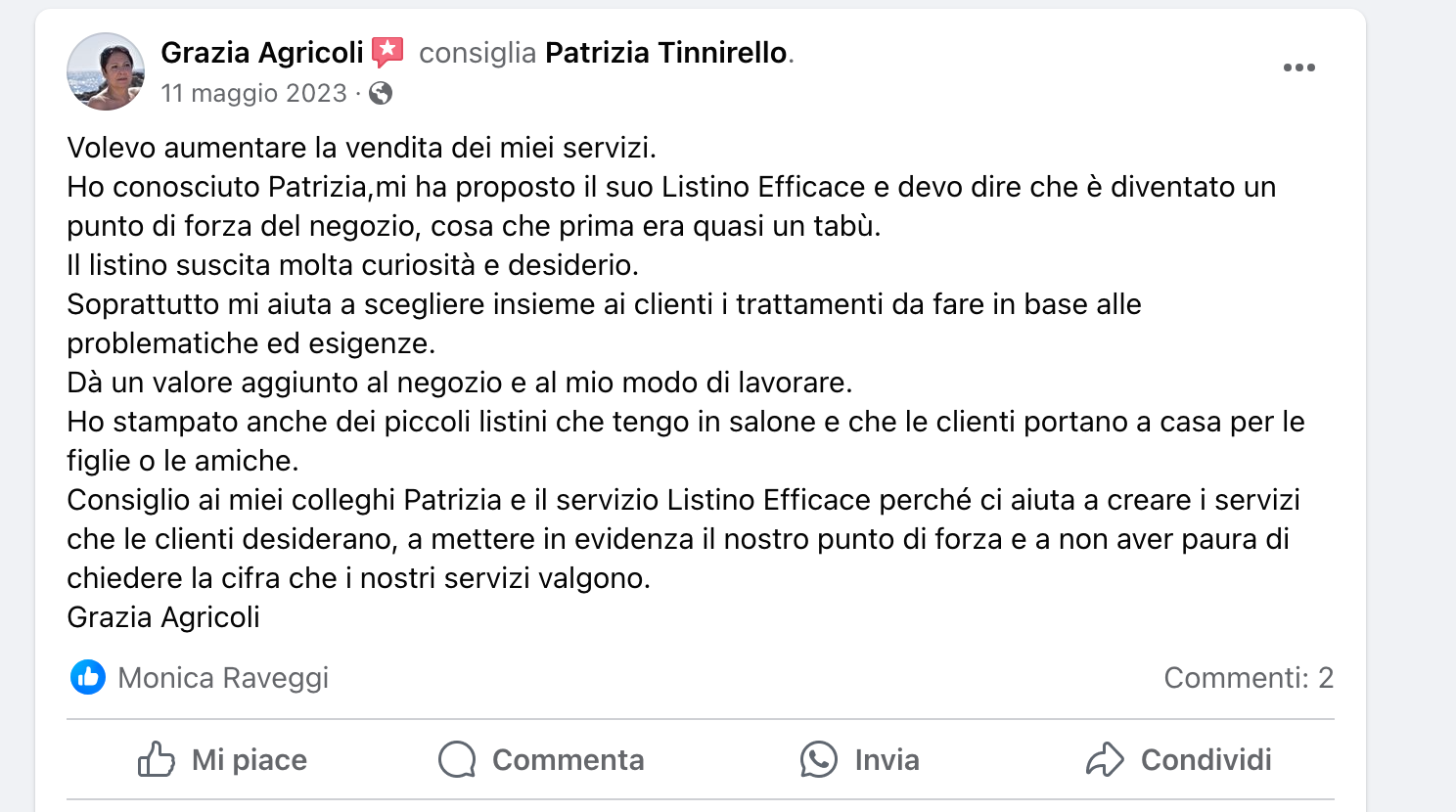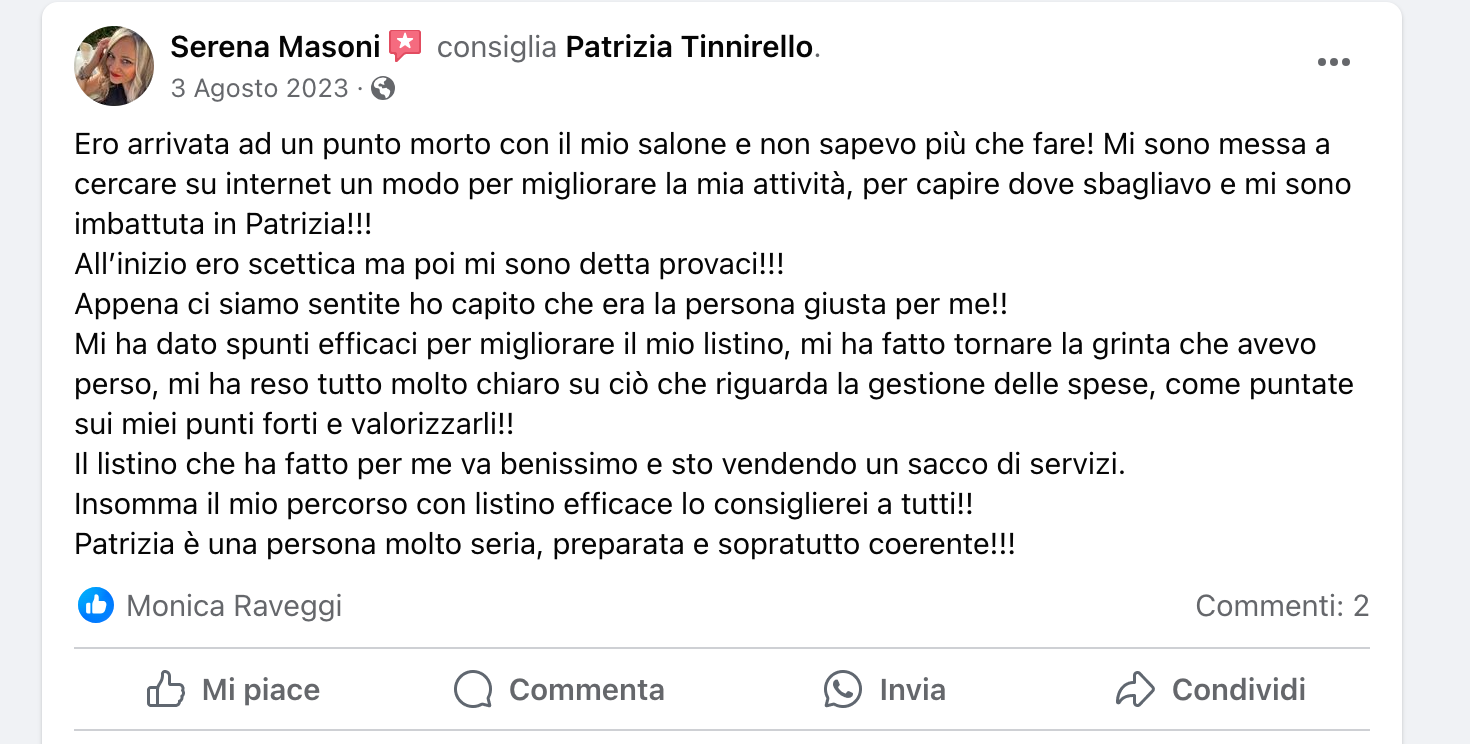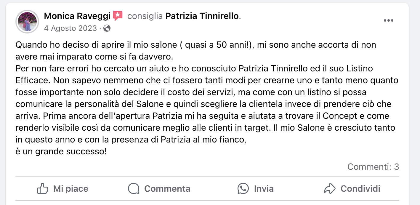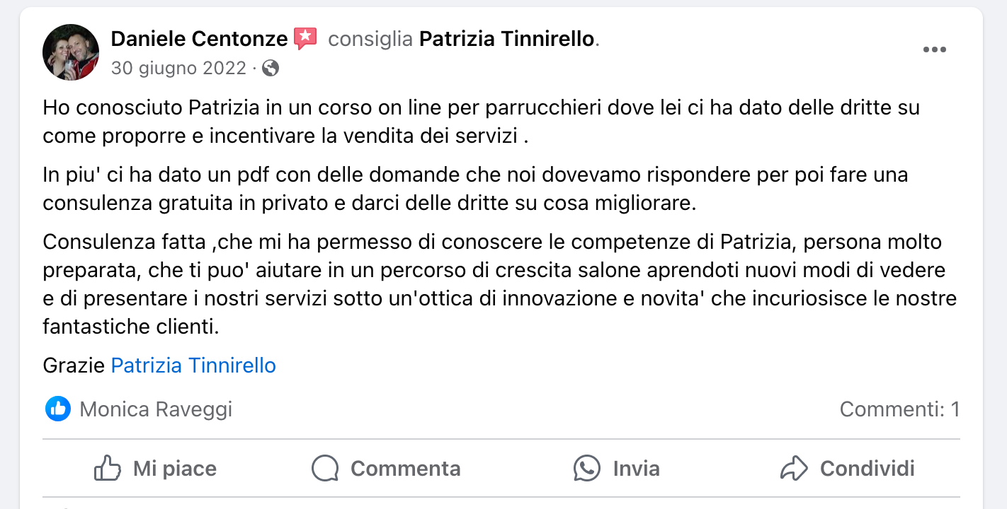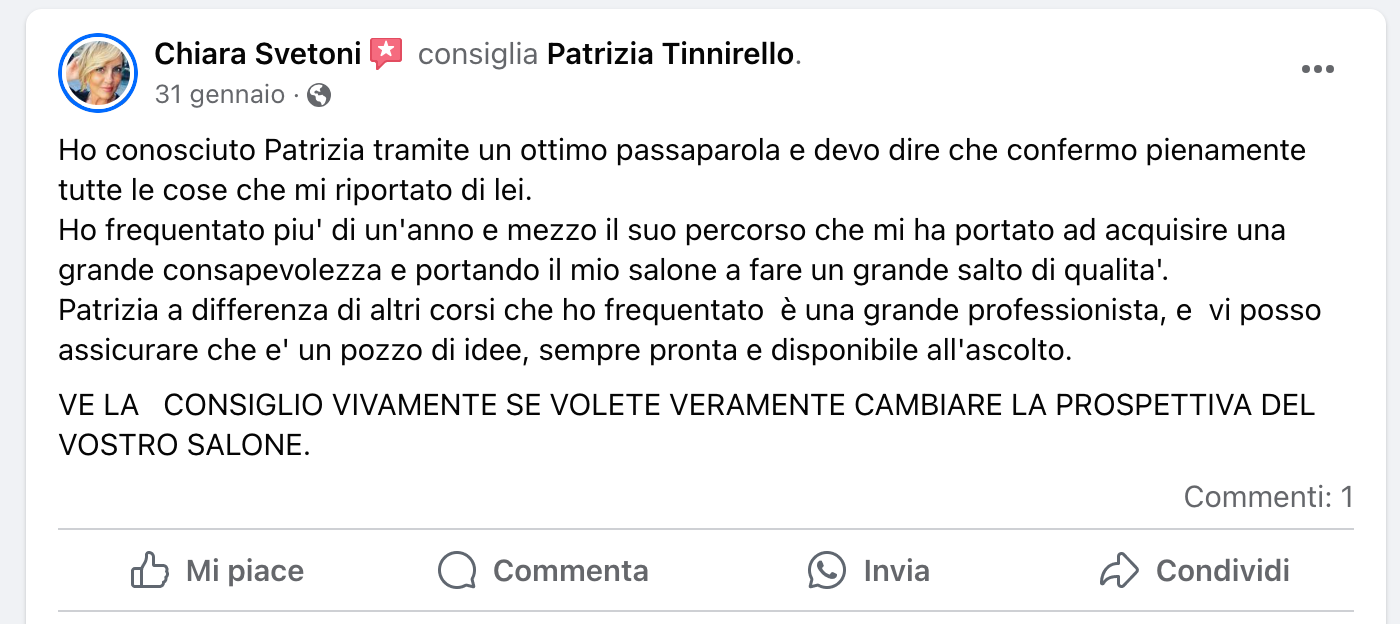 Sono Patrizia Tinnirello, tua ex collega. Ho avuto il salone per ben 37 anni.